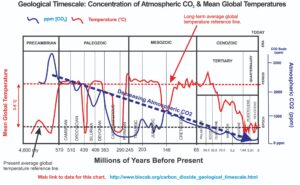 Voor mij was met name deze afbeelding een eyeopener: het laat zien dat de Aarde vooral perioden heeft gekend van veel hogere CO₂-niveaus – van 10-20 x zoveel als nu (420 ppm) – tot wel 8.000 ppm! – en dat terwijl er nog geen mens was om dat te veroorzaken, laat staan te meten. De Aarde floreerde met een rijkdom aan planten, dieren en niet te vergeten het rijke zeeleven.